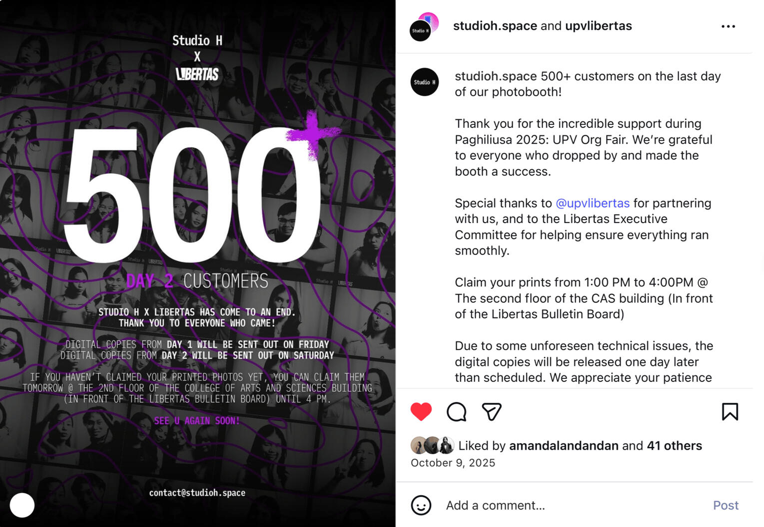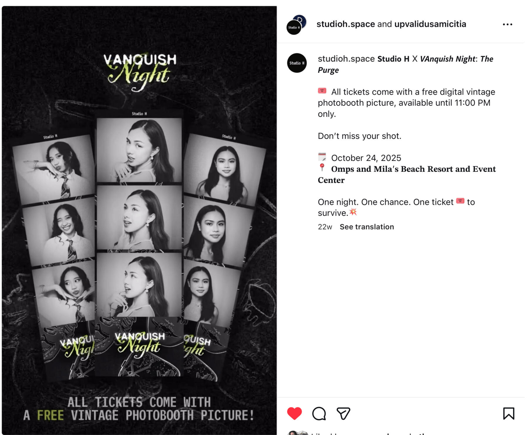 Through Studio H, I pioneered the first vintage-style digital photobooth experience at UP Visayas, featuring custom-developed filters.I successfully executed large-scale pop-ups, including a collaboration with UPV Libertas that served over 500 customers in a single day and a featured installation for VAnquish Night: The Purge